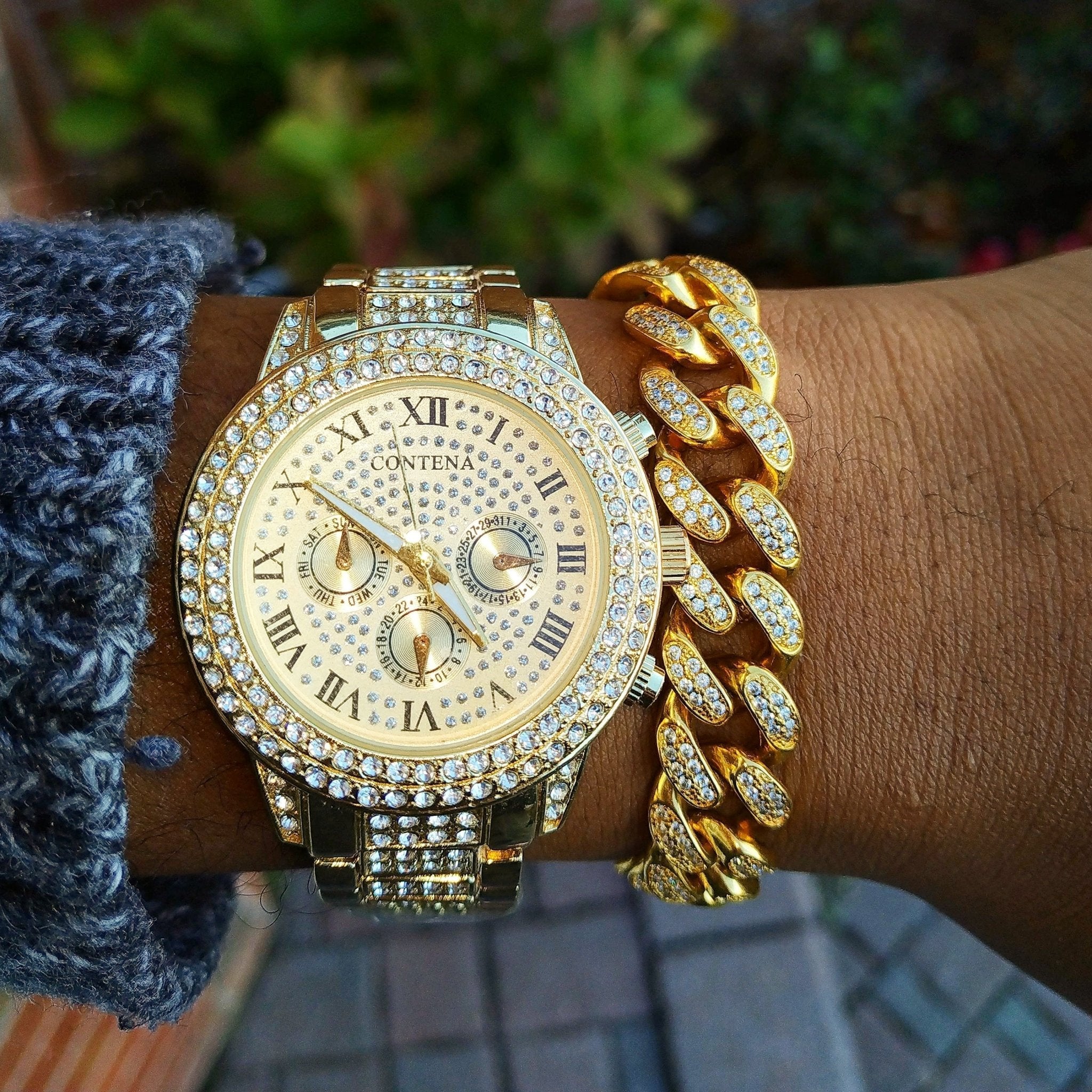 The Miami Double Bezel Watch and Bracelet Set is the perfect set to show off your style and fashion sense.The stylish Diamond Double Bezel Watch teamed up with the Diamond Miami Cuban Link Bracelet for an unforgettable duo.